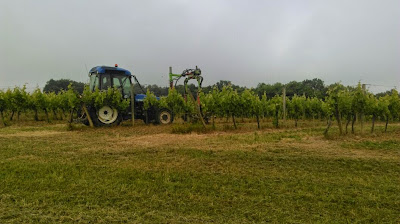 | Hier zijn ze de jonge scheuten van de druiven struiken aan het afdoen |